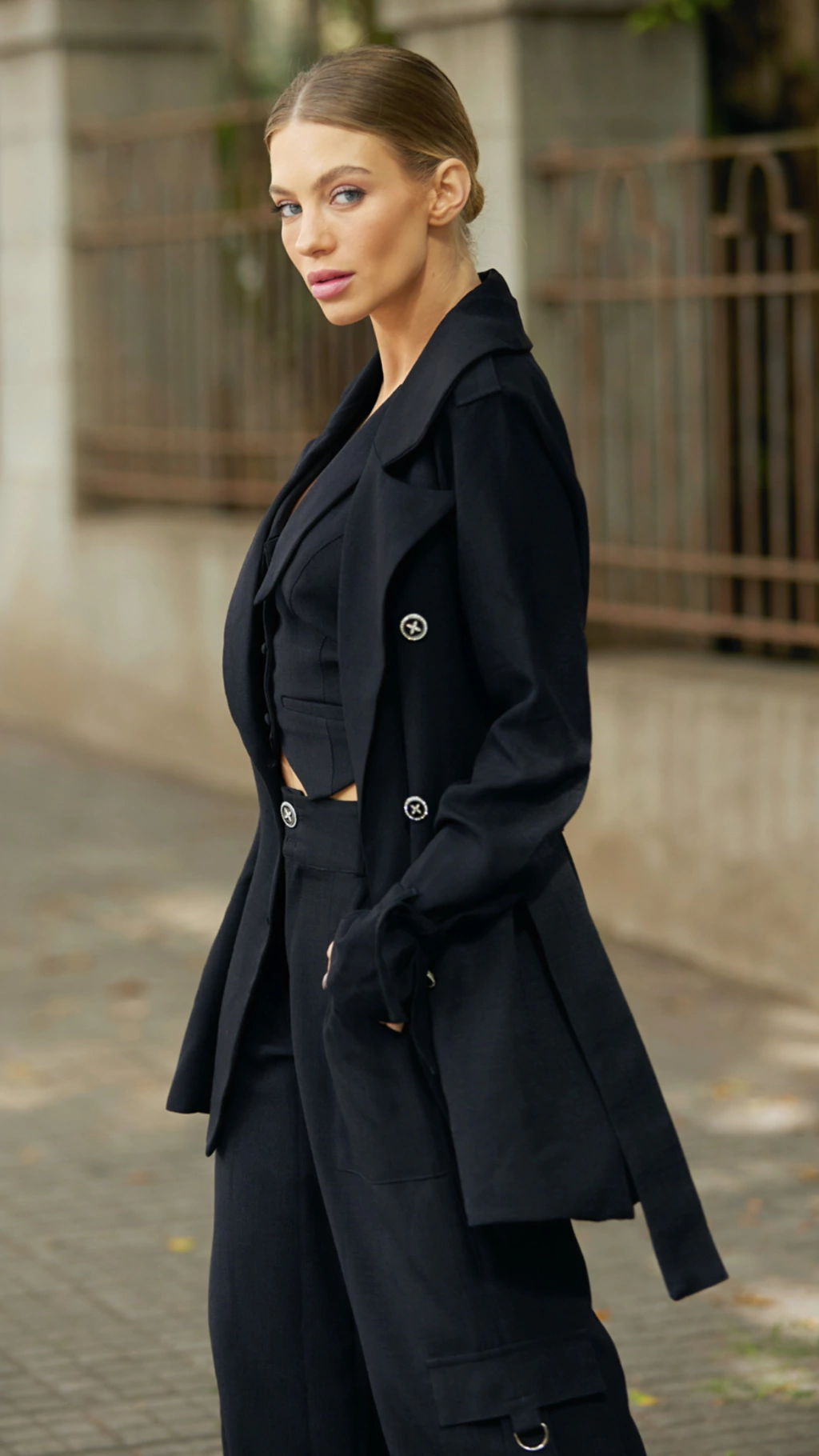 Blazer confeccionado em linho rústico, apresenta mangas longas, fechamento frontal/anterior com botões com brasão da marca, regulagem na cintura com cinto confeccionado com mesmo tecido.