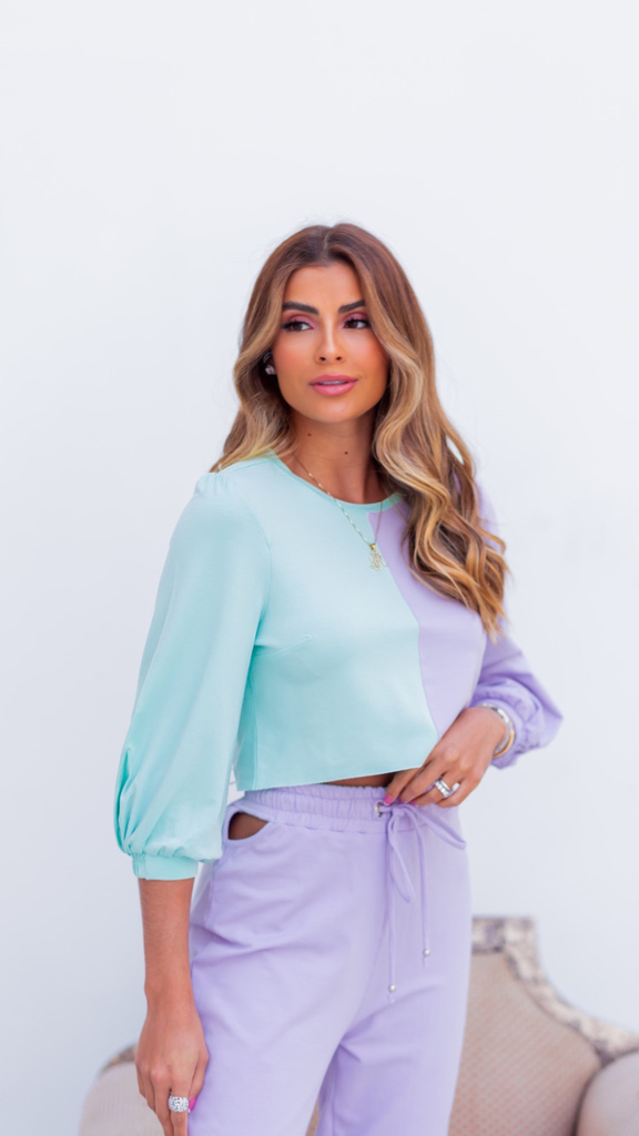 Blusa cropped bicolor confeccionado em moletinho; possui o comprimento curto com corte reto, manga 7/8 bufante, barra corte a fio e decote redondo.