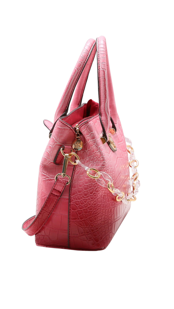 Bolsa modelo satchel da marca chenson, confeccionada em poliuretano de padronagem exclusiva da marca; apresenta detalhe frontal em corrente em metal dourado e acrílico, possui 2 alças: alças de mão fixas e alças removíveis e reguláveis para uso na transversal, ambas produzidas em mesmo tecido poliuretano e aviamentos em metal dourado; apresenta bolso central com repartição interna delimitada por bolsa média fixa; parte interna possui forro com padronagem da marca, pequeno porta objetos e fechamento por zípe.