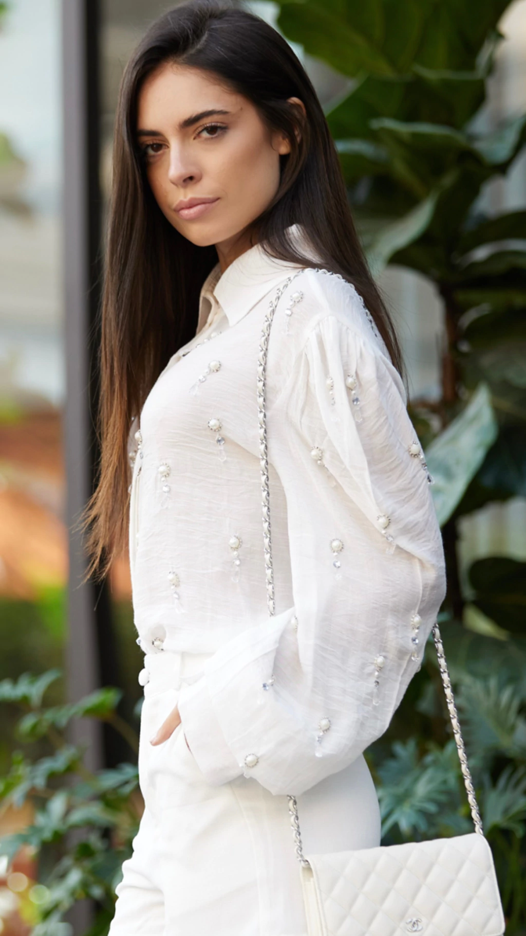 Camisa confeccionada em tecido crepe de seda, apresenta bordada a mão.