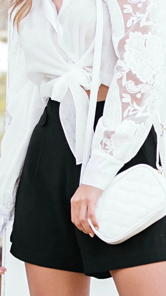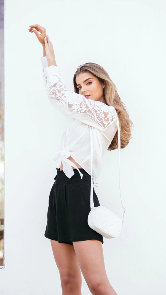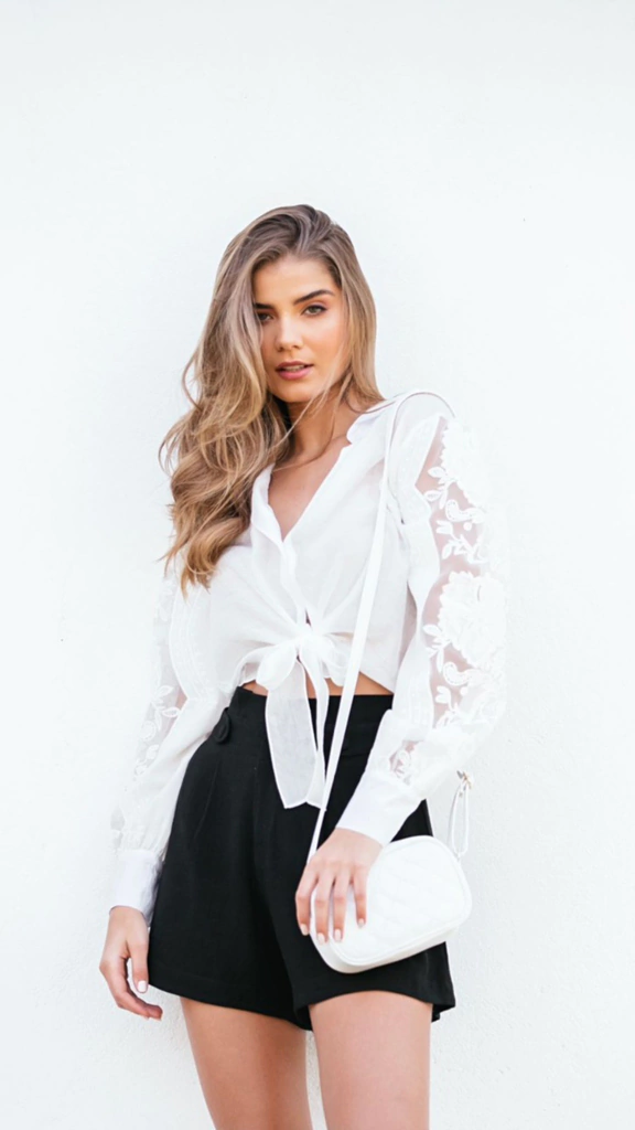 Camisa modelo amarração, confeccionada em musseline, com detalhes em renda.