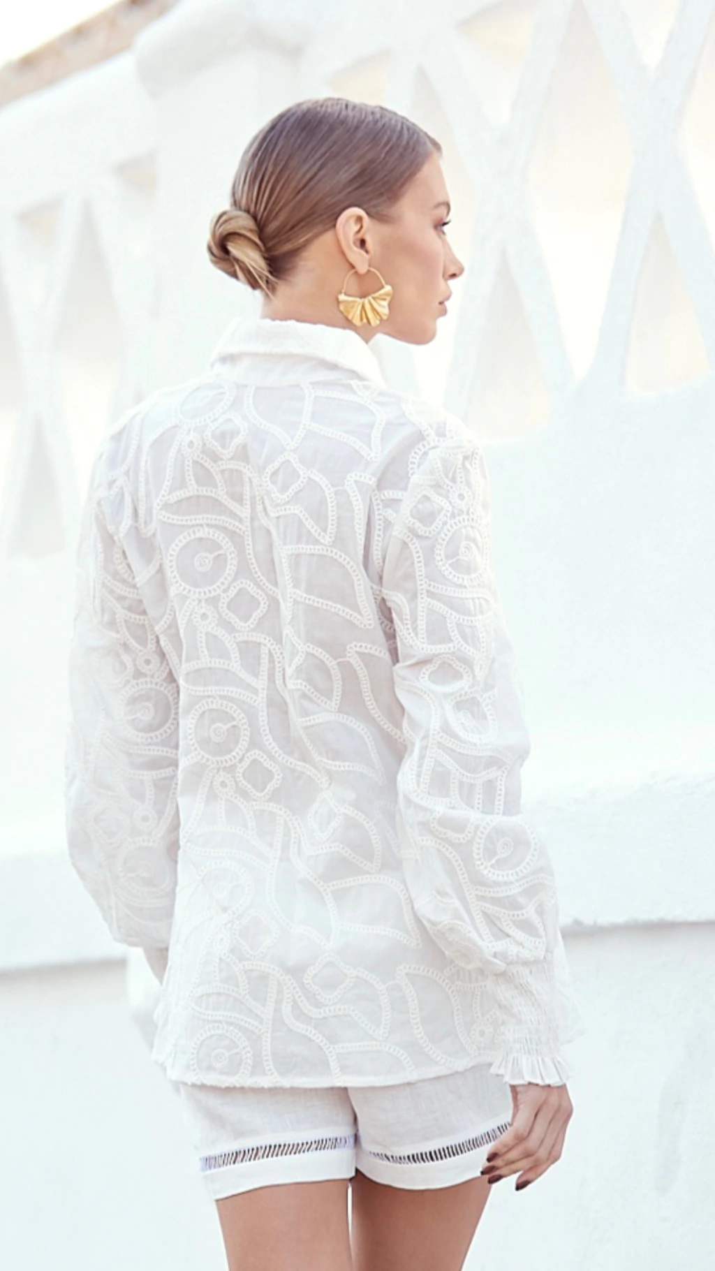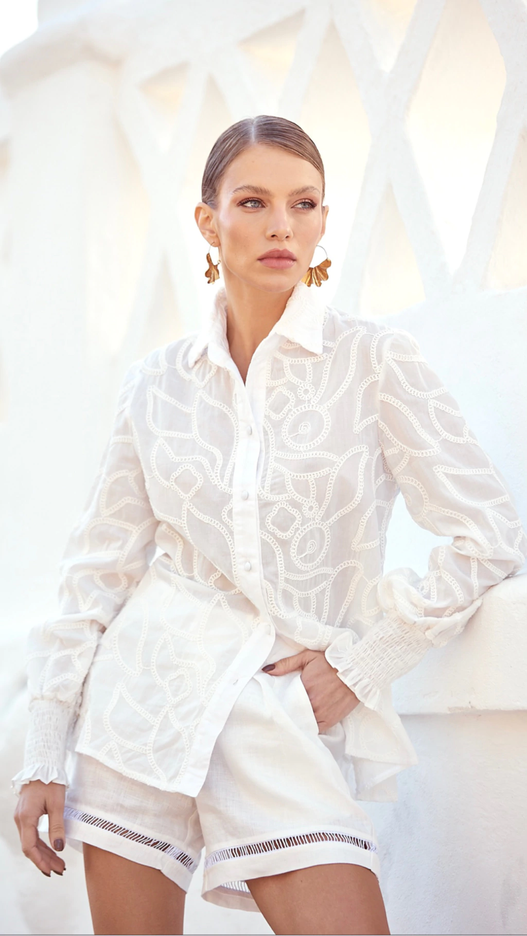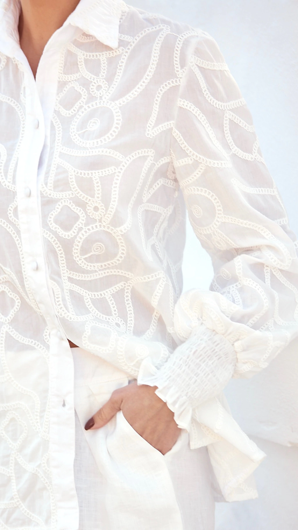 Deslumbre em Detalhes: Camisa em Crepe Bordada em Linha. Explore a riqueza de detalhes desta peça exuberante.