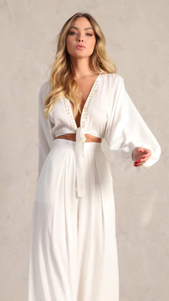 Cropped amarração confeccionado em tecido viscose de linho; apresenta mangas longas e bufantes, peça bordada a mão.
