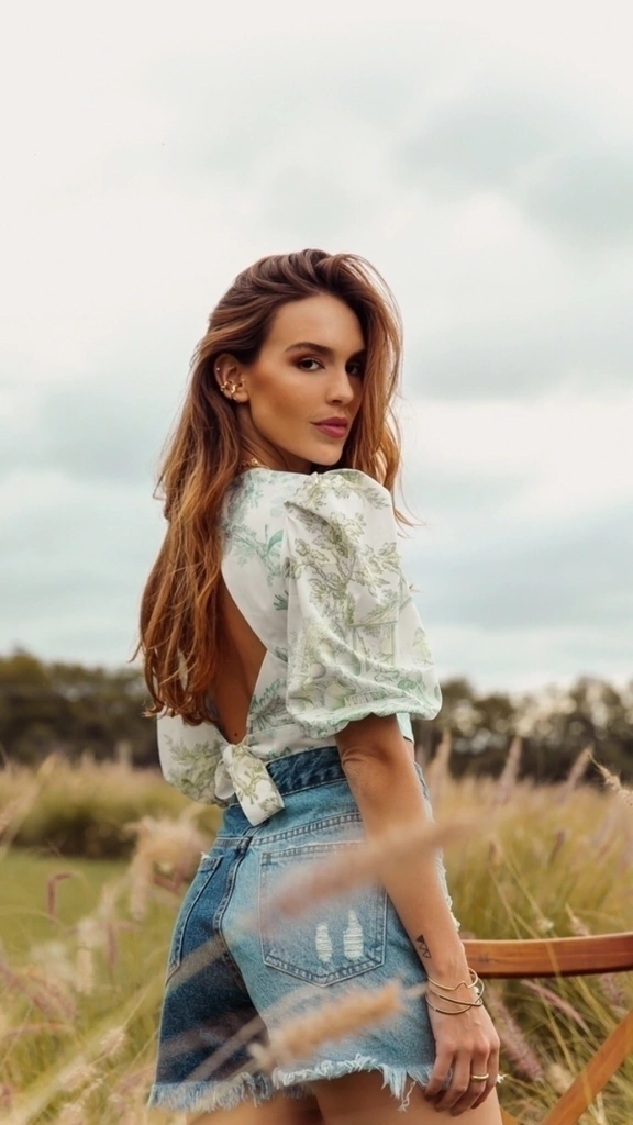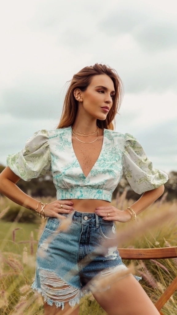 Cropped com estampa exclusiva toile de jouy com ombré, confeccionado em crepe fluido, possui amarração nas costas, mangas bufantes, decote em v profundo, vazado nas costas; peça apresenta forro e dupla faixa feita com tecido principal. (96% poliéster e 4% elastano).