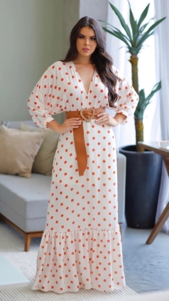 Vestido longo poá, confeccionado em tecido crepe. Cinto apenas ilustrativo.