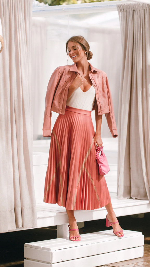 Saia midi plissada com recortes em malha scuba com leve brilho.