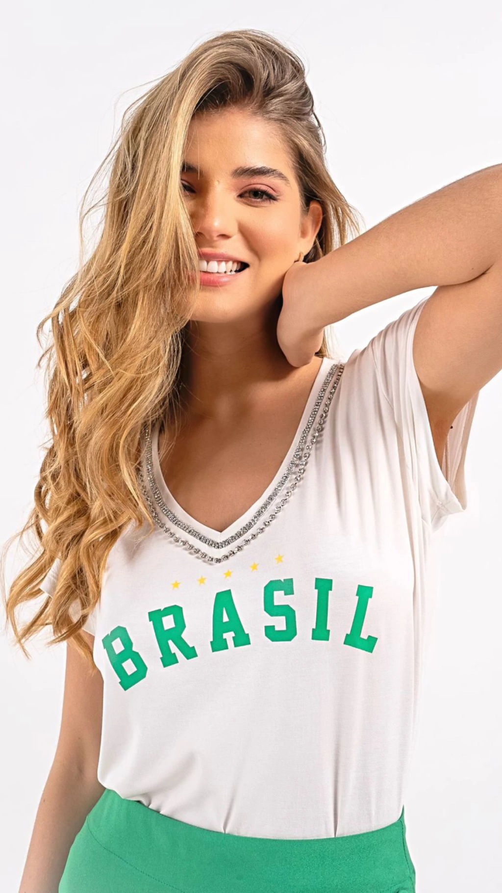 T-shirt confeccionada em tecido algodão, com estampa do Brasil, apresenta detalhes em strass na gola.