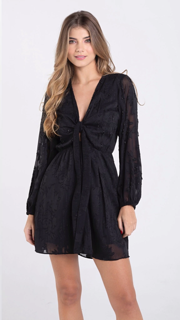 Vestido curto confeccionado em chifon; peça bordada a mão nas partes anterior e mangas; apresenta mangas longas, detalhe frontal em amarração no busto e fechamento posterior por zíper invisível.