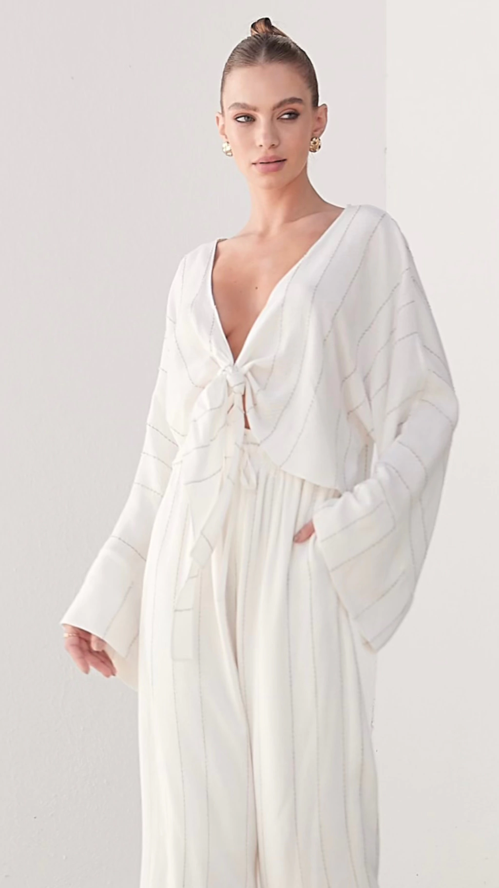 O conjunto Mykonos é uma combinação única de blusa e calça confeccionadas em uma mescla de linho e algodão, com detalhes sutis em lurex que adicionam um brilho discreto e elegante às peças.
