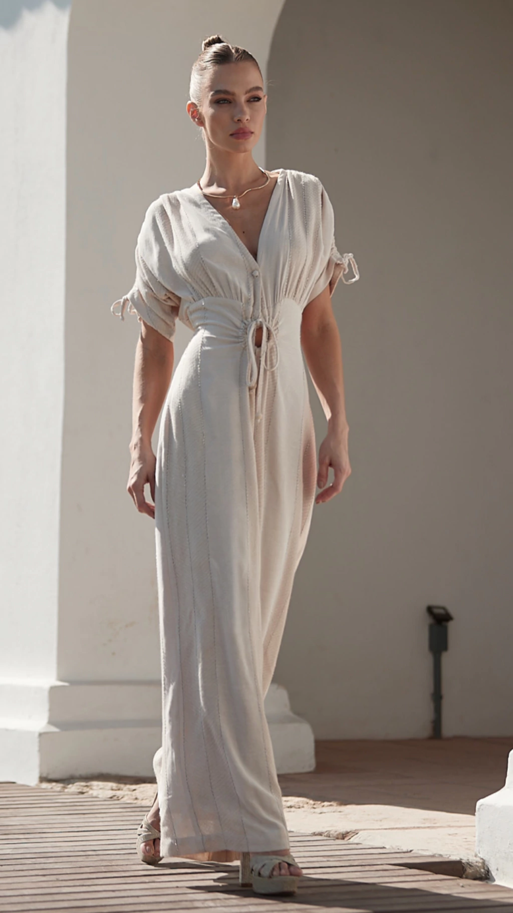 Confeccionado em linho e algodão, o macacão oferece a combinação perfeita de leveza e frescor. Além disso, o detalhe em lurex adiciona um brilho discreto e sofisticado à peça, garantindo que você se destaque em qualquer evento, com um visual diferenciado e elegante.