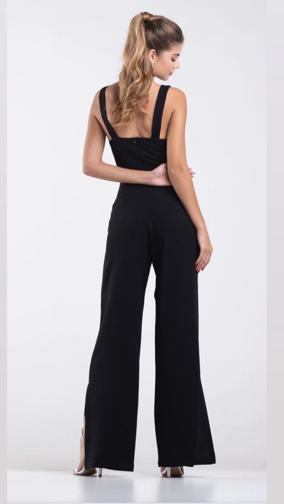Macacão longo alfaiataria, confeccionado em linho; apresenta detalhes frontais em recortes, bolsos bilaterais, possui detalhe em fenda curta bilateralmente em região do tornozelo e fechamento posterior por zíper invisível.