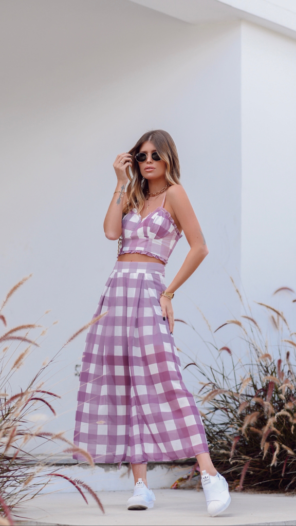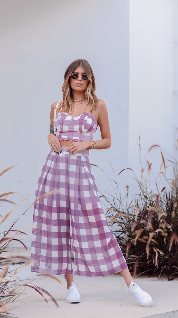 Pantacourt xadrez confeccionado em musseline com toque de seda com leve transparência, padronagem em degradê, possui estampa e cores exclusivas; apresenta pregas frontais que proporciona movimento à peça; possui forro e cós embutido.