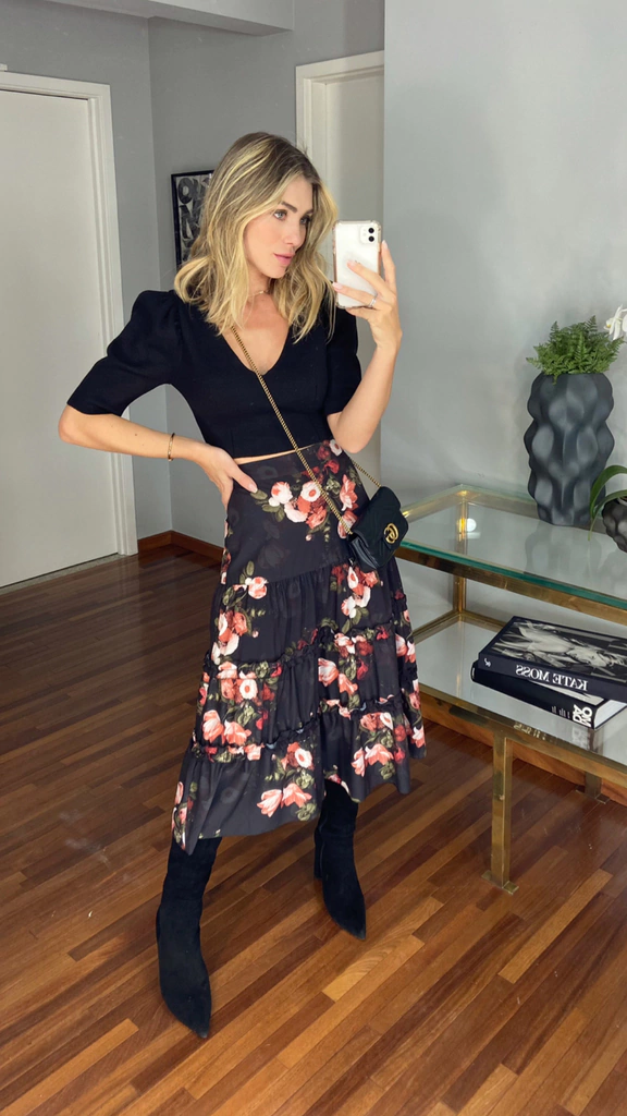 Saia midi em camadas é confeccionada em tecido crepe toque de seda 97% poliéster e 3% elastano; apresenta modelagem evasê, possui estampa exclusiva; peça apresenta forro e zíper invisível nas costas.