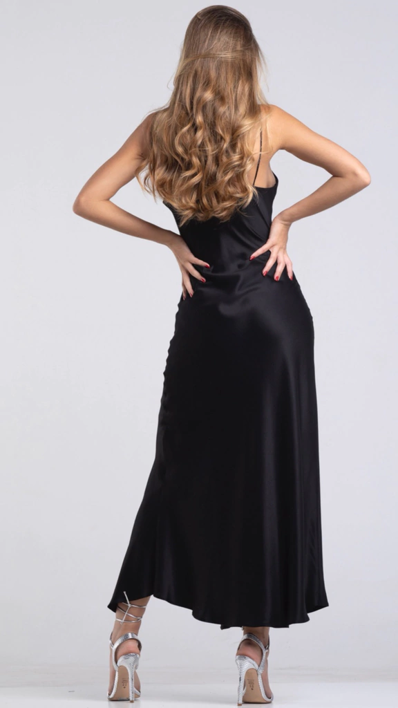 Vestido longo, confeccionado em tecido crepe acetinado; peça com decote em vê transpassado, com botões laterais forrados com mesmo tecido e fenda lateral.