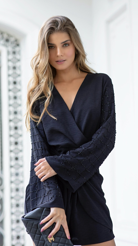Vestido curto, modelo transpasse, confeccionado em tecido crepe; apresenta mangas longas com bordado em vidrilhos feito à mão; detalhe amarração por tecido do mesmo vestido que vai da cintura para parte anterior do vestido.