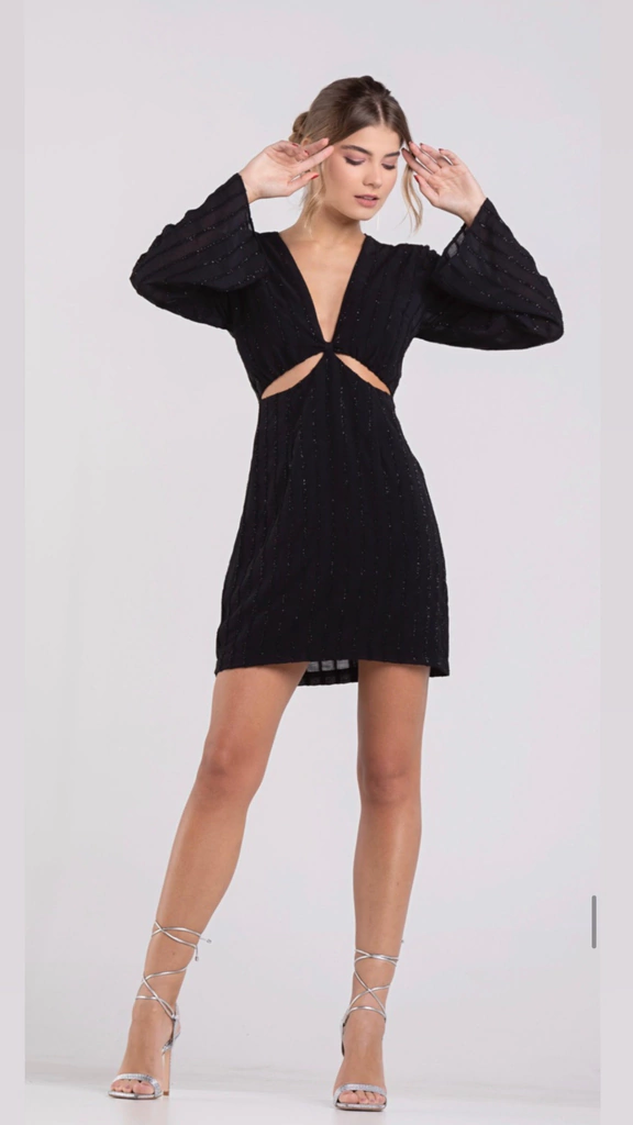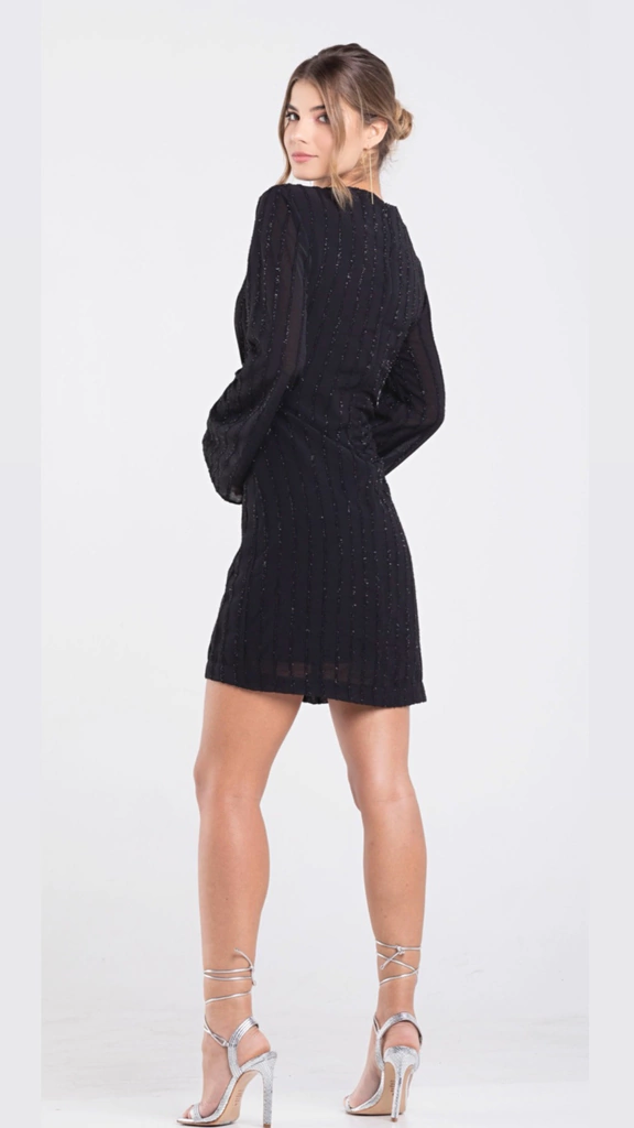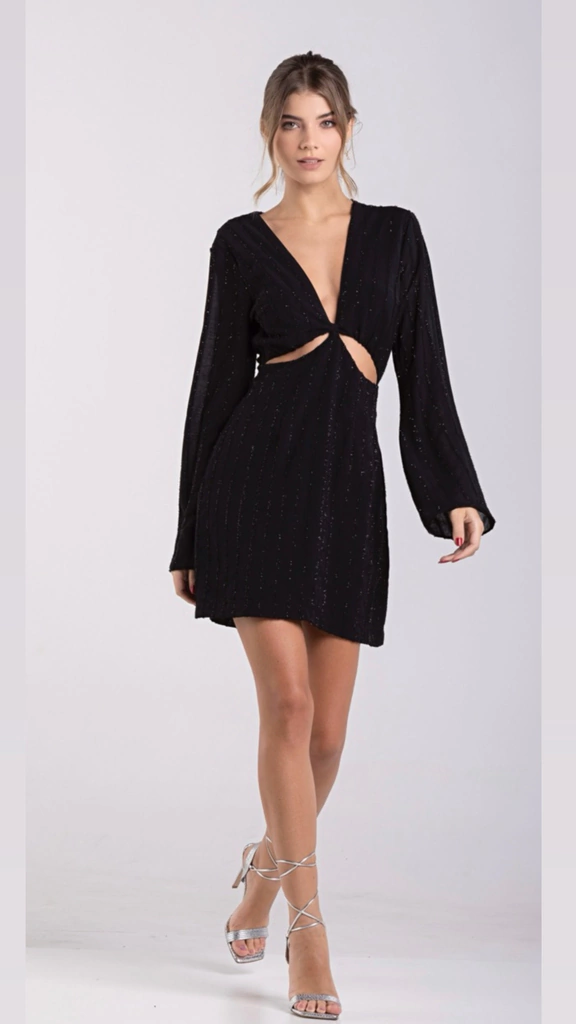 Vestido curto confeccionado em chifon com lurex; apresenta mangas longas, detalhe frontal em recortes e fechamento posterior por zíper invisível.