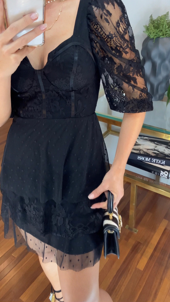 Vestido com decote coração, possui modelagem corselet é uma saia em camadas super romântica, fazendo um composê perfeito em renda e tule poá; está peça possui mangas blusê, zíper invisível nas costas, bojo e forro interno. (Renda: 100% poliamida; tule poá: 100% poliamida; crepe: 100% poliéster).