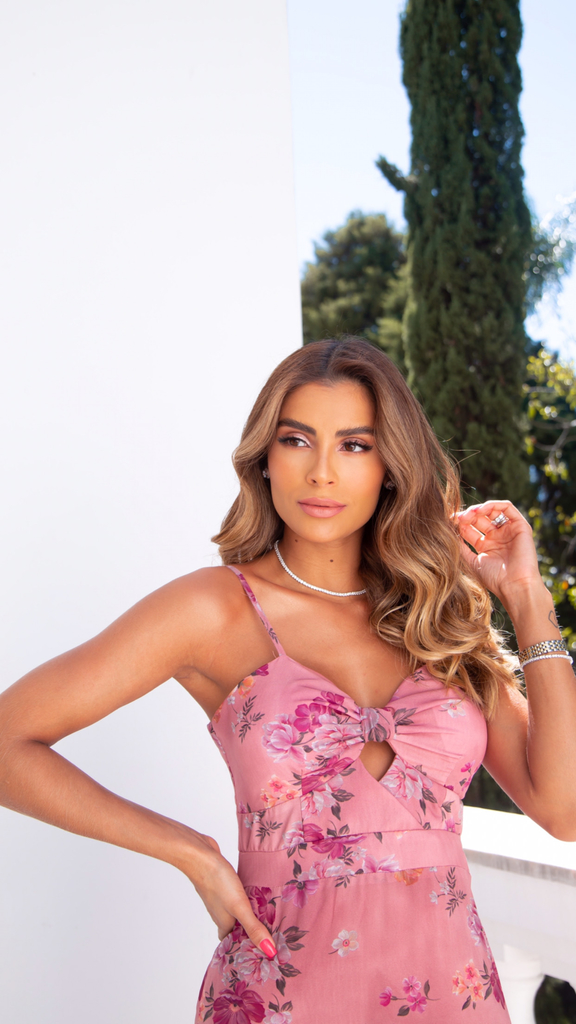 Vestido longo confeccionado em chiffon leve; possui detalhes em babados e estampa exclusiva com floral vintage; apresenta regulador de alças, bojo, forro, zíper invisível e elástico nas costas.